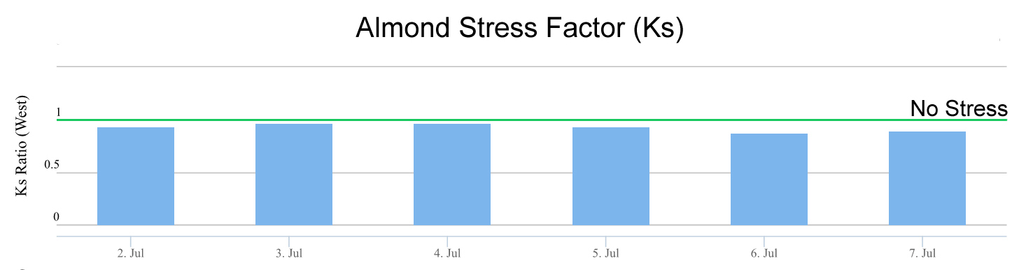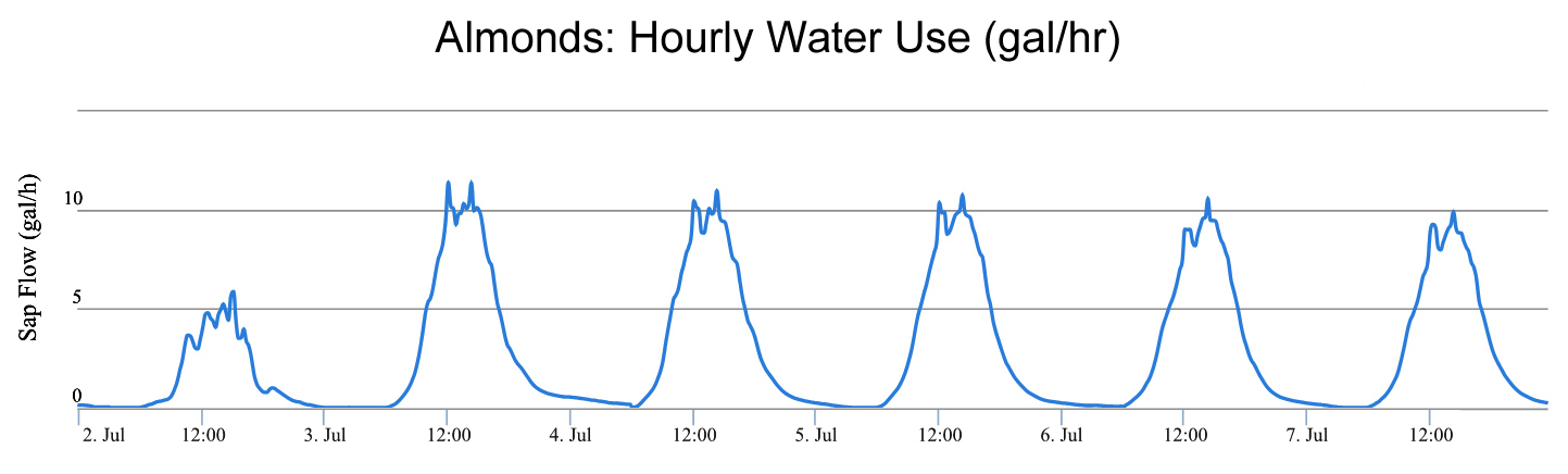 If sap flow or plant water use data is compared to ET at the site, a “Stress Factor” can be produced. A tree recently irrigated and using as much water as it needs, the Stress Factor would be 1.0. If a Stress Factor is 0.75, the tree would be using 75% as much water as a well-watered tree.