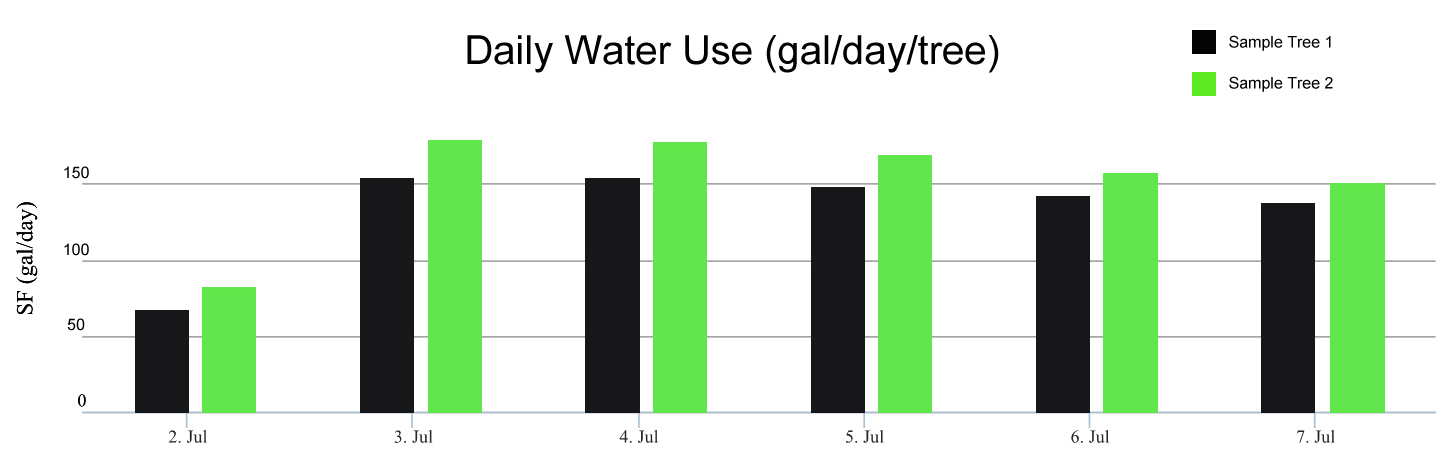 The daily water use totals of representative plants are used to estimate total tree water use for an average tree. This can then be multiplied by the number of trees per acre to get total water use per acre.